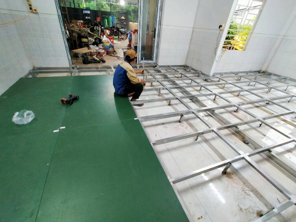 Dựng khung sắt (hoặc gỗ) vững chắc, loại sắt dùng có thể là sắt hộp 4x8cm hoặc loại 5x10cm tùy theo khoảng cách sàn. Nếu sàn có diện tích lơn ưu tiên dùng sắt lớn hơn để đảm bảo độ chịu lực. Khoảng cách giữa các thanh xà gồ từ 30-35cm đối với tấm lót loại 15mm và 40-45cm đối với tấm lót 17mm là phù hợp và đảm bảo đúng kỷ thuật.